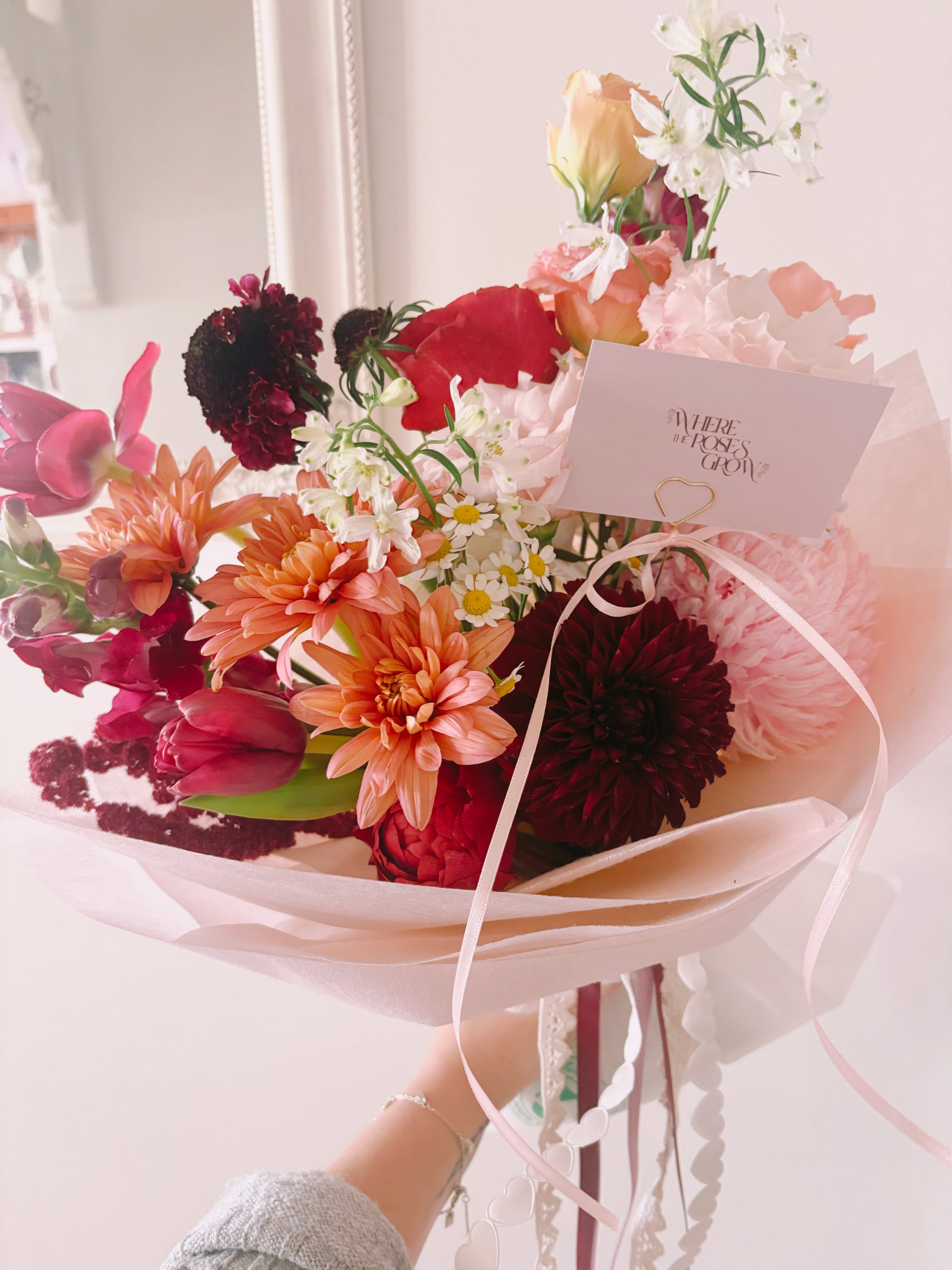 Lovingly wrapped in layers of soft tissue and finished with trailing red ribbons, The Catherine embodies the “Where the Roses Grow” signature — wild, romantic, and effortlessly beautiful.