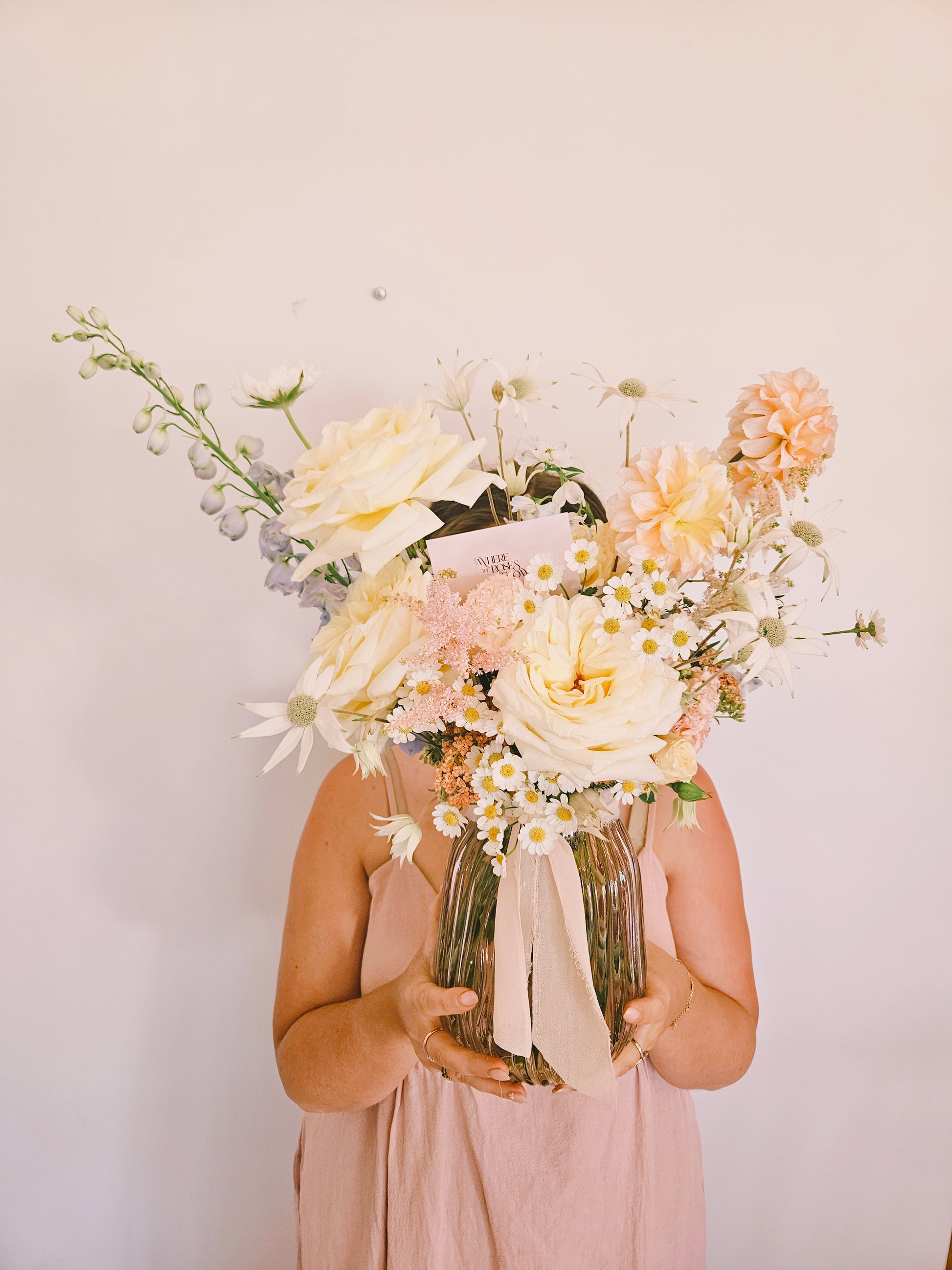 The Lila is a relaxed, cottage-garden style bouquet filled with warm peaches, buttery creams and soft chamomile tones. Light, textural and joy-filled, she feels like a slow afternoon in the garden — effortless and romantic without trying too hard.