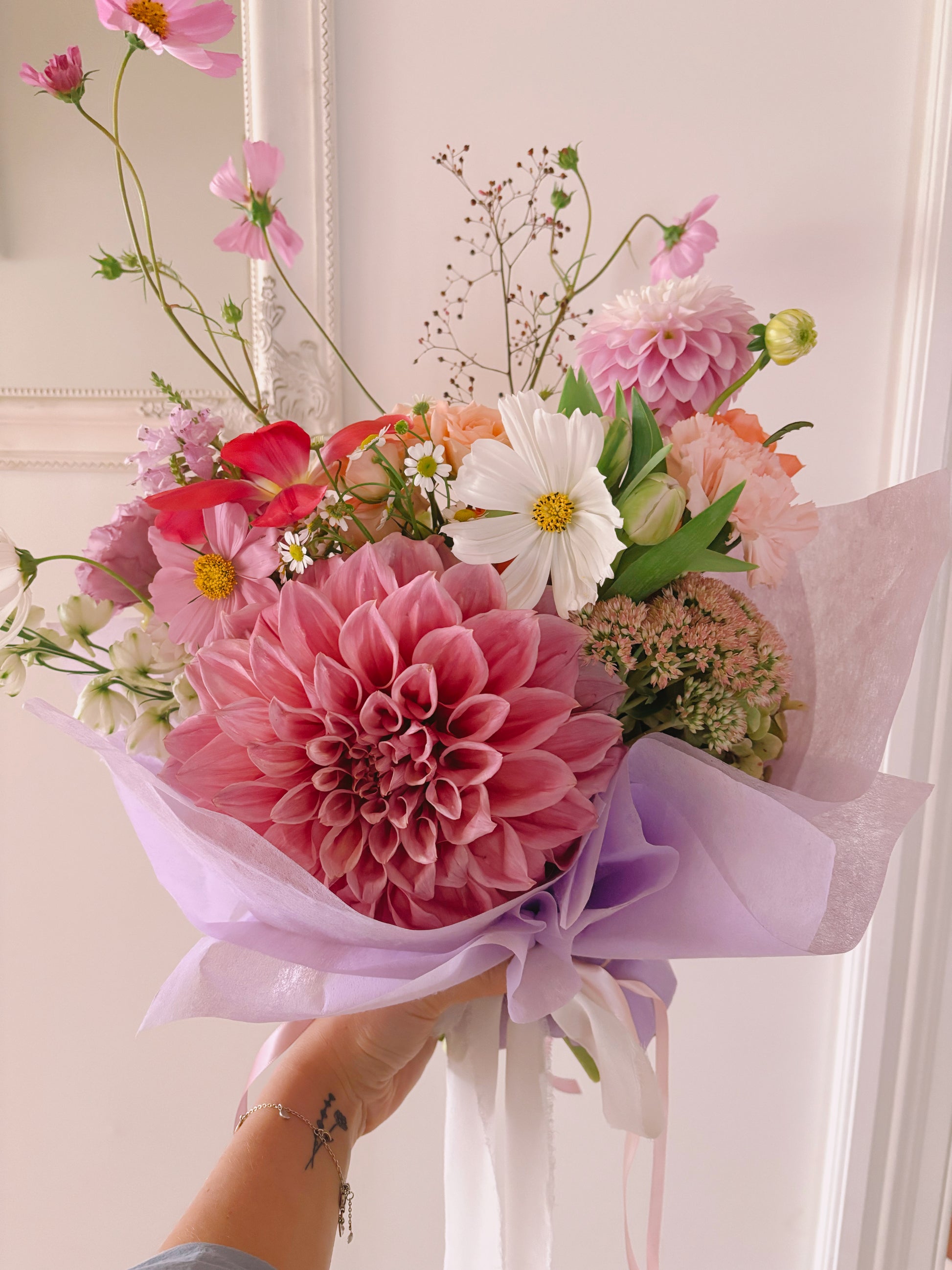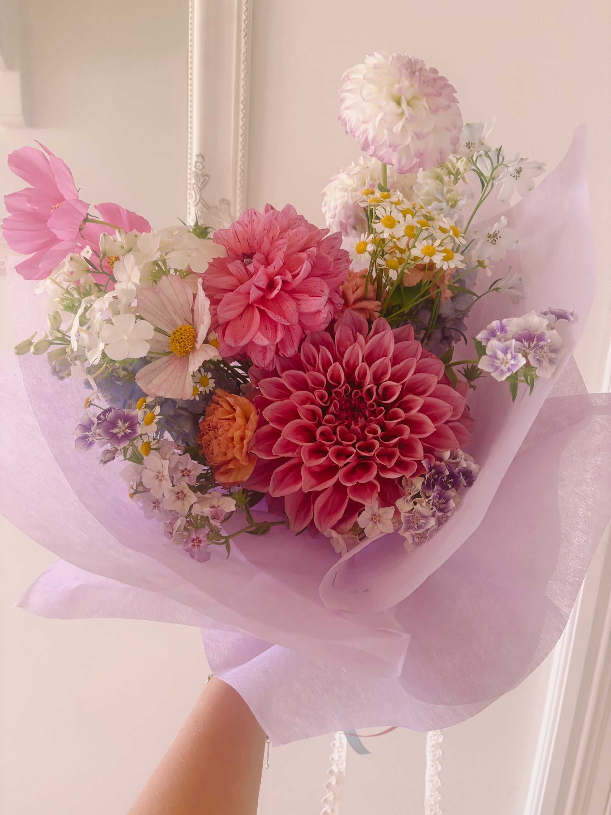 Designed in dreamy tones of mauve, lilac and dusty pink, The Molly is filled with delicate seasonal flowers and airy textures that create movement and charm. Gentle layers of colour and whimsical details make this bouquet feel both elegant and effortless.
